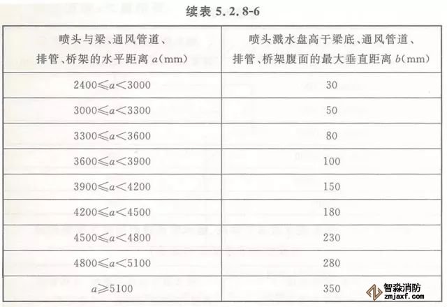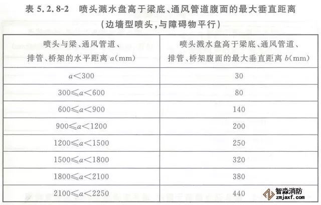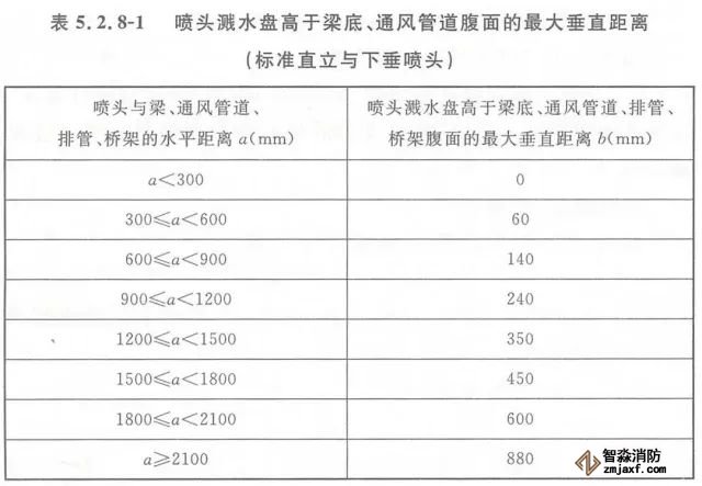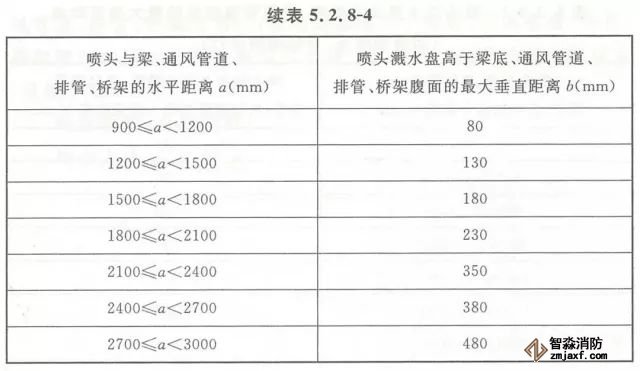 5.2.8 當噴頭濺水盤高于附近梁底或高于寬度小于1.2m的通風管道、排管、橋架腹面時,噴頭濺水盤高于梁底、通風管道、排管、橋架腹面的最大垂直距離應符合表5.2.8-1~表5.2.8-9的規(guī)定(見圖5.2.8)。