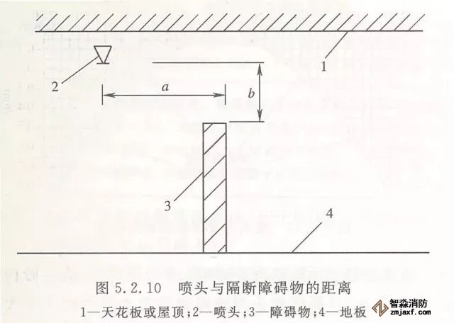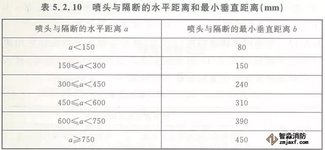 5.2.10 當噴頭安裝在不到頂?shù)母魯喔浇鼤r,噴頭與隔斷的水平距離和最小垂直距離應符合表5.2.10的規(guī)定(見圖5.2.10)。