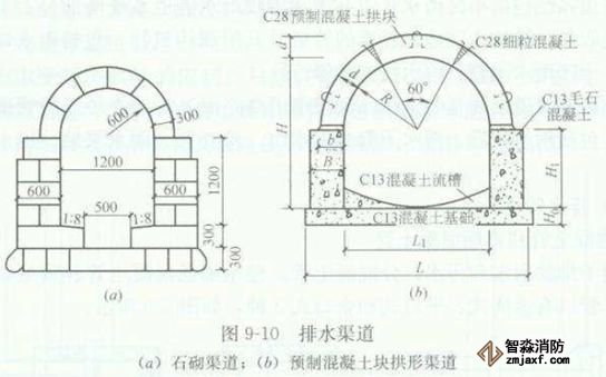 排水渠道一般有磚砌、石砌、鋼筋混凝土渠道,斷面形式有圓形、矩形、半橢圓形等,如圖所示。
