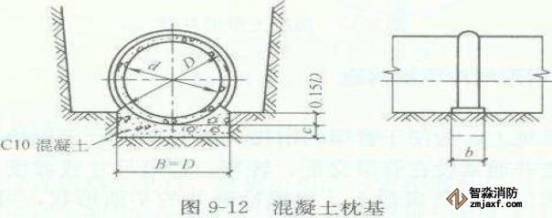 混凝土枕基是只在管道接口處才設置的管道局部基礎,如圖9-12所示。通常在管道接口下用C1O混凝土做成枕狀墊塊,墊塊常采用900或1350管座。這種基礎適用于干燥土壤中的雨水管道及不太重要的污水支管,常與砂土基礎聯(lián)合使用。
