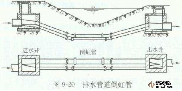 排水管道遇到河流、洼地、或地下構筑物等障礙物時,不能按原有的坡度埋設,而是按凹的折線方式從障礙物下通過,這種管道稱為倒虹管。它由進水井、下行管、平行管、上行管和出水井組成。