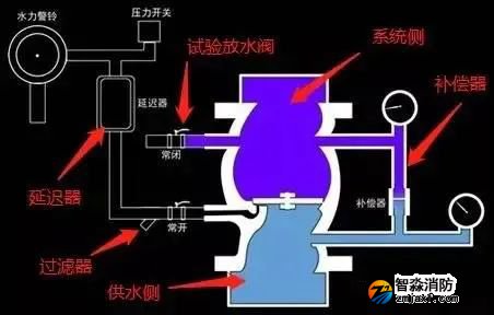 1、濕式報(bào)警閥結(jié)構(gòu)中名稱如圖所示,相對(duì)來說比較簡單。其中延遲器和補(bǔ)償器都是防止管網(wǎng)內(nèi)水流波動(dòng)導(dǎo)致閥組誤開啟的措施。試驗(yàn)放水閥可以在閥組上開啟后,達(dá)到只開啟閥組而不用運(yùn)轉(zhuǎn)整個(gè)系統(tǒng)來測試閥組的功能的作用。閥瓣伺應(yīng)狀態(tài)下封閉住報(bào)警管路,當(dāng)閥瓣開啟后,水流流入報(bào)警管路,充滿延遲器,觸動(dòng)壓力開關(guān)、水力警鈴報(bào)警。