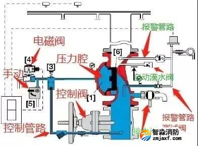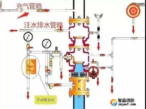 預(yù)作用閥組,從結(jié)構(gòu)上是雨淋閥與濕式閥的組合。其管路以及功能上和濕式閥和雨淋閥的設(shè)置以及功能均相同。為什么預(yù)作用閥組上部一定要配一個(gè)濕式報(bào)警閥,主要原因是系統(tǒng)側(cè)充有有壓氣體,需要濕式報(bào)警閥來實(shí)現(xiàn)密封氣體。
