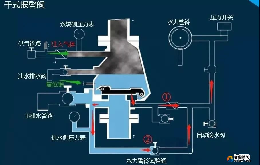 3)圖示中路線①為報(bào)警路線,發(fā)生火災(zāi)后閥瓣開啟,水流進(jìn)入報(bào)警管路(后續(xù)和濕式一致不再重復(fù))。這里關(guān)鍵是當(dāng)閥瓣開啟后由于干式報(bào)警閥閥瓣的前端結(jié)構(gòu),使其可以順時(shí)針通過復(fù)位銷,而無法逆時(shí)針自動(dòng)復(fù)位(會(huì)卡在復(fù)位銷位置)。