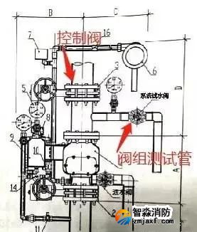 雨淋閥的各管路名稱及作用如圖所示,其中需要注意報(bào)警測試管路以及自動(dòng)滴水閥的位置。雨淋閥組的測試管設(shè)置于閥后,如圖3,閥組開啟后,關(guān)閉閥后控制閥(避免水流進(jìn)入保護(hù)區(qū)),開啟測試管,水會(huì)從測試管流出。
