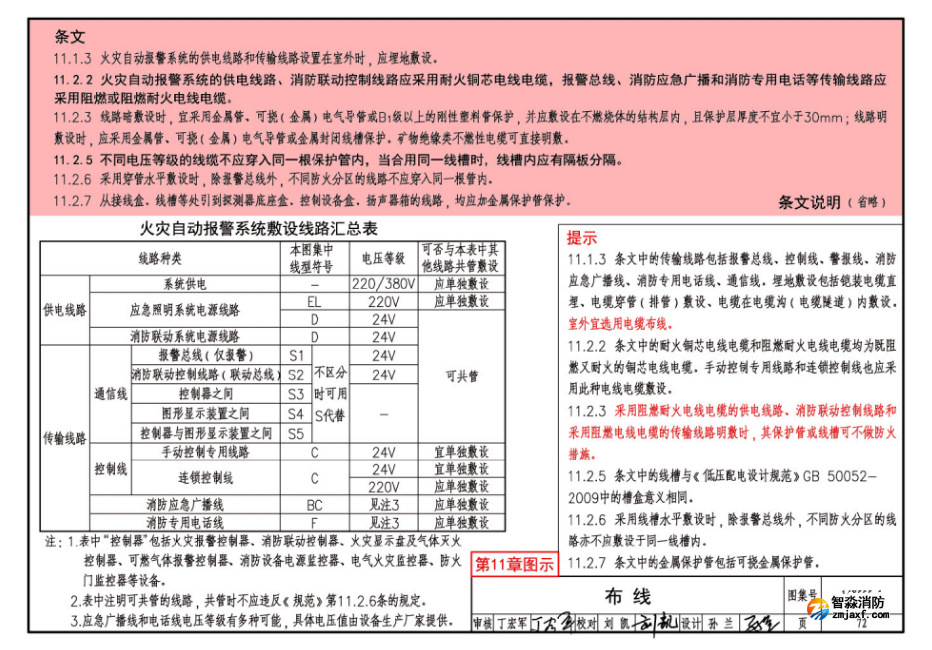 提示11.2.3 采用阻燃耐火電線電纜的供電線路、消防聯(lián)動控制線路和采用阻燃電線電纜的傳輸線路明敷時,其保護管或線槽可不做防火措施。
