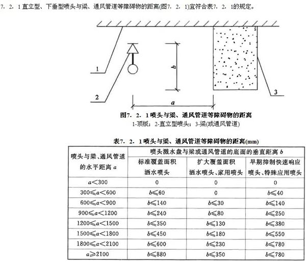 直立型灑水噴頭濺水盤(pán)與頂板的距離應(yīng)為75mm~150mm,并應(yīng)符合下列規(guī)定:1 當(dāng)在梁或其他障礙物底面下方的平面上布置灑水噴頭時(shí),濺水盤(pán)與頂板的距離不應(yīng)大于300mm,同時(shí)濺水盤(pán)與梁等障礙物底面的垂直距離應(yīng)為25mm~100mm。2 當(dāng)在梁間布置灑水噴頭時(shí),灑水噴頭與梁的距離應(yīng)符合本規(guī)范第7.2.1條的規(guī)定。確有困難時(shí),濺水盤(pán)與頂板的距離不應(yīng)大于550mm。梁間布置的灑水噴頭,濺水盤(pán)與頂板距離達(dá)到550mm仍不能符合本規(guī)范第7.2.1條的規(guī)定時(shí),應(yīng)在梁底面的下方增設(shè)灑水噴頭。3 密肋梁板下方的灑水噴頭,濺水盤(pán)與密肋梁板底面的垂直距離應(yīng)為25mm~100mm。