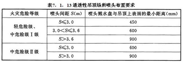 裝設(shè)網(wǎng)格、柵板類(lèi)通透性吊頂?shù)膱?chǎng)所,當(dāng)通透面積占吊頂總面積的比例大于70%時(shí),噴頭應(yīng)設(shè)置在吊頂上方,并應(yīng)符合下列規(guī)定:1 通透性吊頂開(kāi)口部位的凈寬度不應(yīng)小于10mm,且開(kāi)口部位的厚度不應(yīng)大于開(kāi)口的最小寬度;2 噴頭間距及濺水盤(pán)與吊頂上表面的距離應(yīng)符合表7.1.13的規(guī)定。