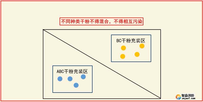 (3)ABC干粉、BC干粉充裝設(shè)備分別獨(dú)立設(shè)置,充裝場地完全分隔開。不同種類干粉不得混合,不得相互污染。