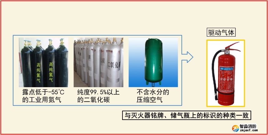 (6)儲壓式干粉滅火器和潔凈氣體滅火器可選用露點(diǎn)低于-55℃的工業(yè)用氮?dú)狻⒓兌?9.5%以上的二氧化碳、不含水分的壓縮空氣等作為驅(qū)動氣體,但要與滅火器銘牌、儲氣瓶上標(biāo)識的種類一致。
