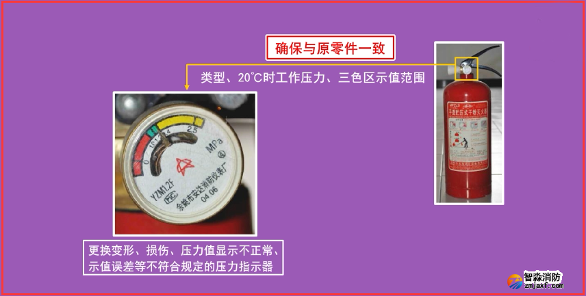 (5)更換具有嚴(yán)重?fù)p傷、變形、銹蝕等影響使用的缺陷的滅火器壓把、提把等金屬件;更換存在肉眼可見缺陷的儲氣瓶式滅火器的頂針。