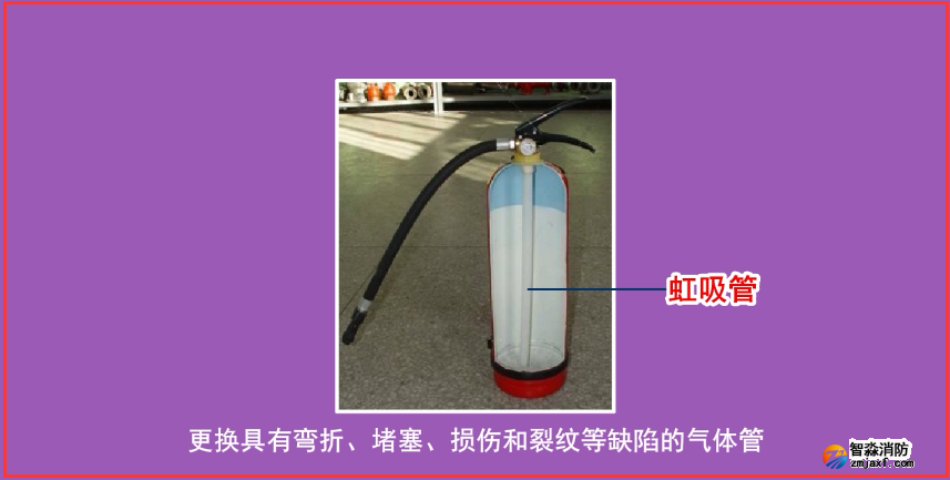 (6)更換具有彎折、堵塞、損傷和裂紋等缺陷的滅火器虹吸管、儲氣瓶式滅火器出氣管。