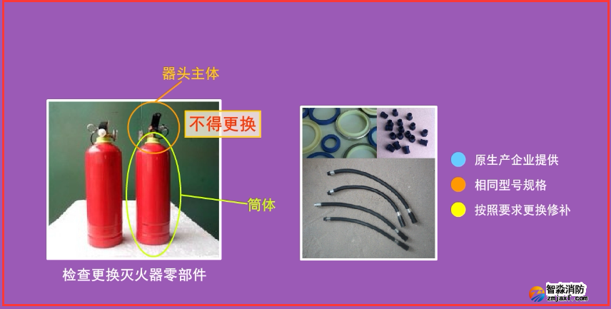 對滅火器零部件檢查后,更換密封件和損壞的零部件,但不得更換滅火器筒體和器頭主體。所有需要更換的零部件應(yīng)采用原生產(chǎn)企業(yè)提供、推薦的相同型號規(guī)格的產(chǎn)品,并按照下列要求更換、修補(bǔ)零部件: