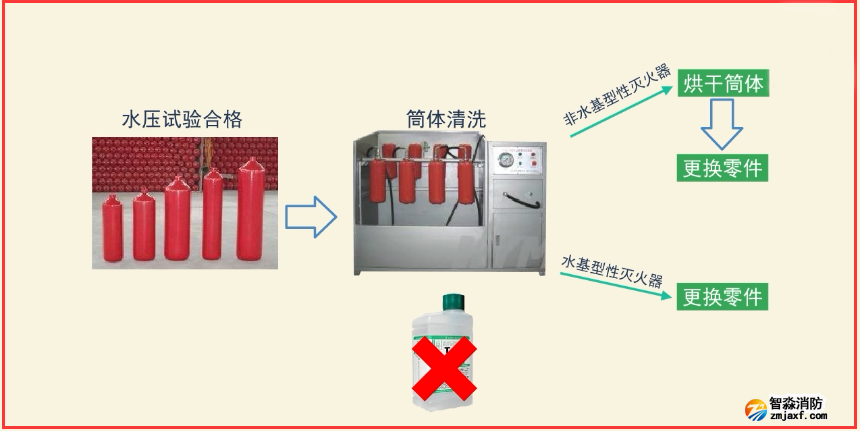 首先進(jìn)行滅火器外觀檢查,再按照拆卸、報(bào)廢處理、水壓試驗(yàn)、清洗干燥、更換零部件、再充裝及氣密性試驗(yàn)、維修出廠檢驗(yàn)、建立維修檔案等程序逐次實(shí)施維修。